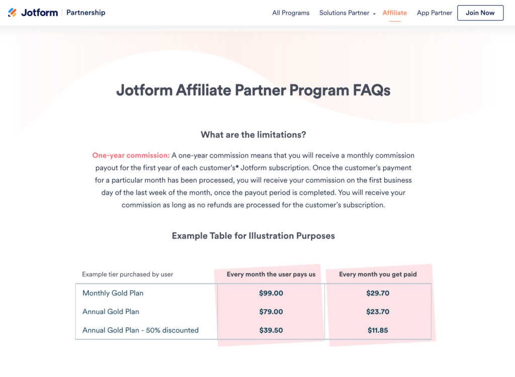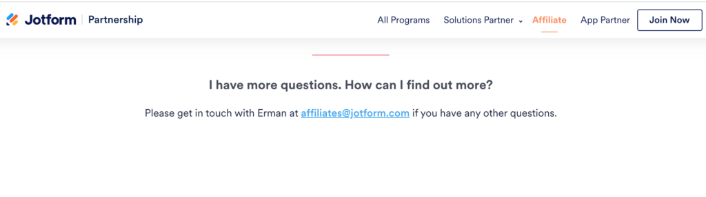 A great example of this is Jotform’s Affiliate program. The Jotform Affiliate page has both a detailed FAQ section and a list that contains the contact information of the Jotform Affiliate Team. This enables their affiliates to immediately reach out to them: